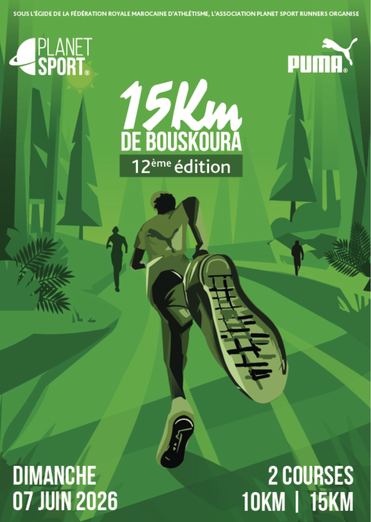 The 15 km de Bouskoura is a road running event organized by the Planet Sport Runners association and held in the Bouskoura forest near Casablanca. The race takes place in one of the largest green areas in the region, known for its eucalyptus trees and natural trails, offering a natural environment close to the city. The event includes two race formats, 10 km and 15 km, and attracts a large number of participants from different nationalities. It is open to amateur and experienced runners, with online registration available as well as additional options through partners and group registrations.