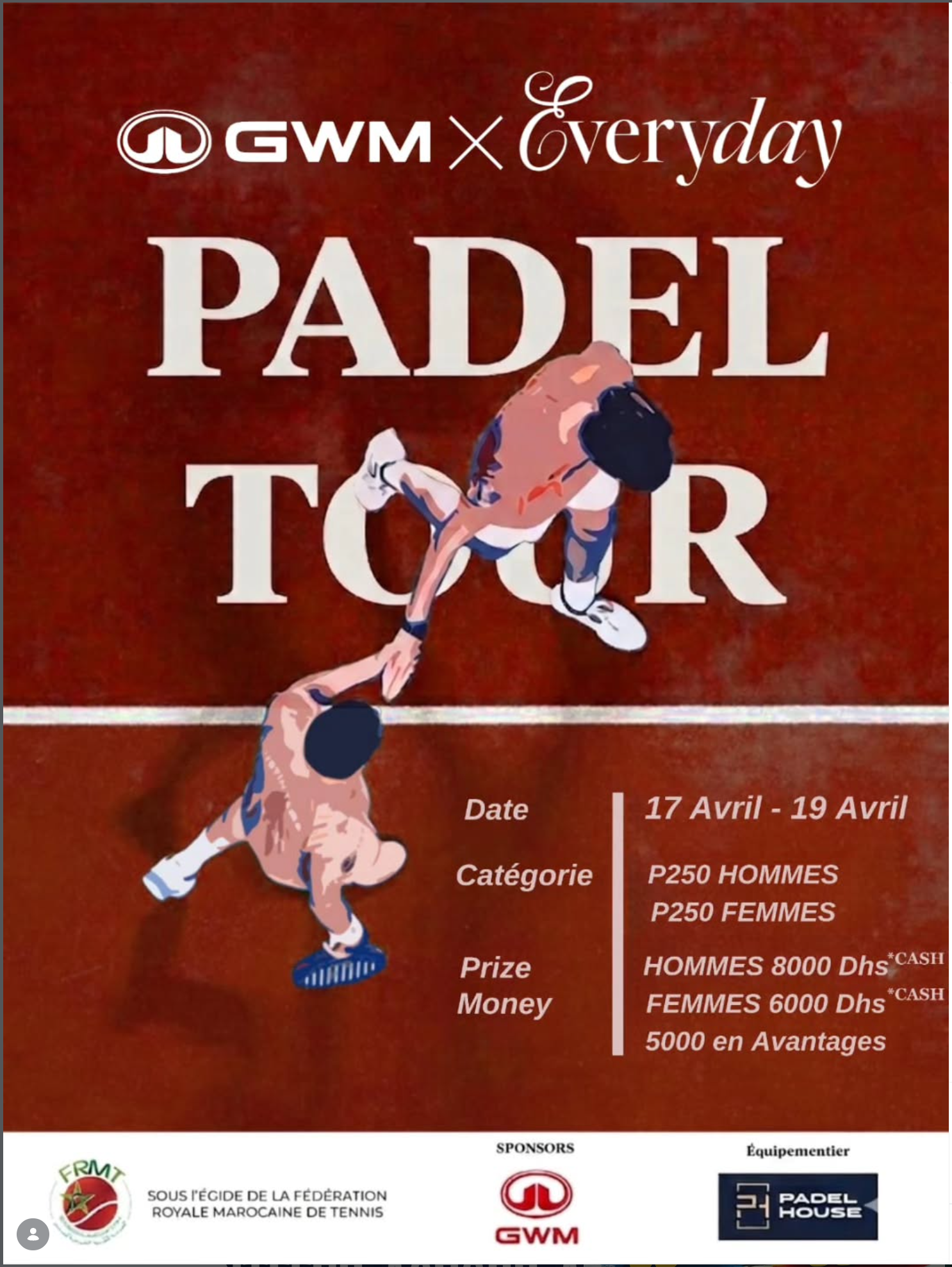 An FRMT padel tournament launched by Everyday in partnership with GWM, taking place at Everyday The Wellness Society in Bouskoura. The event is structured as a competitive club tournament with men’s and women’s P250 categories. The tournament includes prize money of 14,000 Dhs plus 5,000 Dhs in benefits. Participation is organized through the FRMT registration platform.