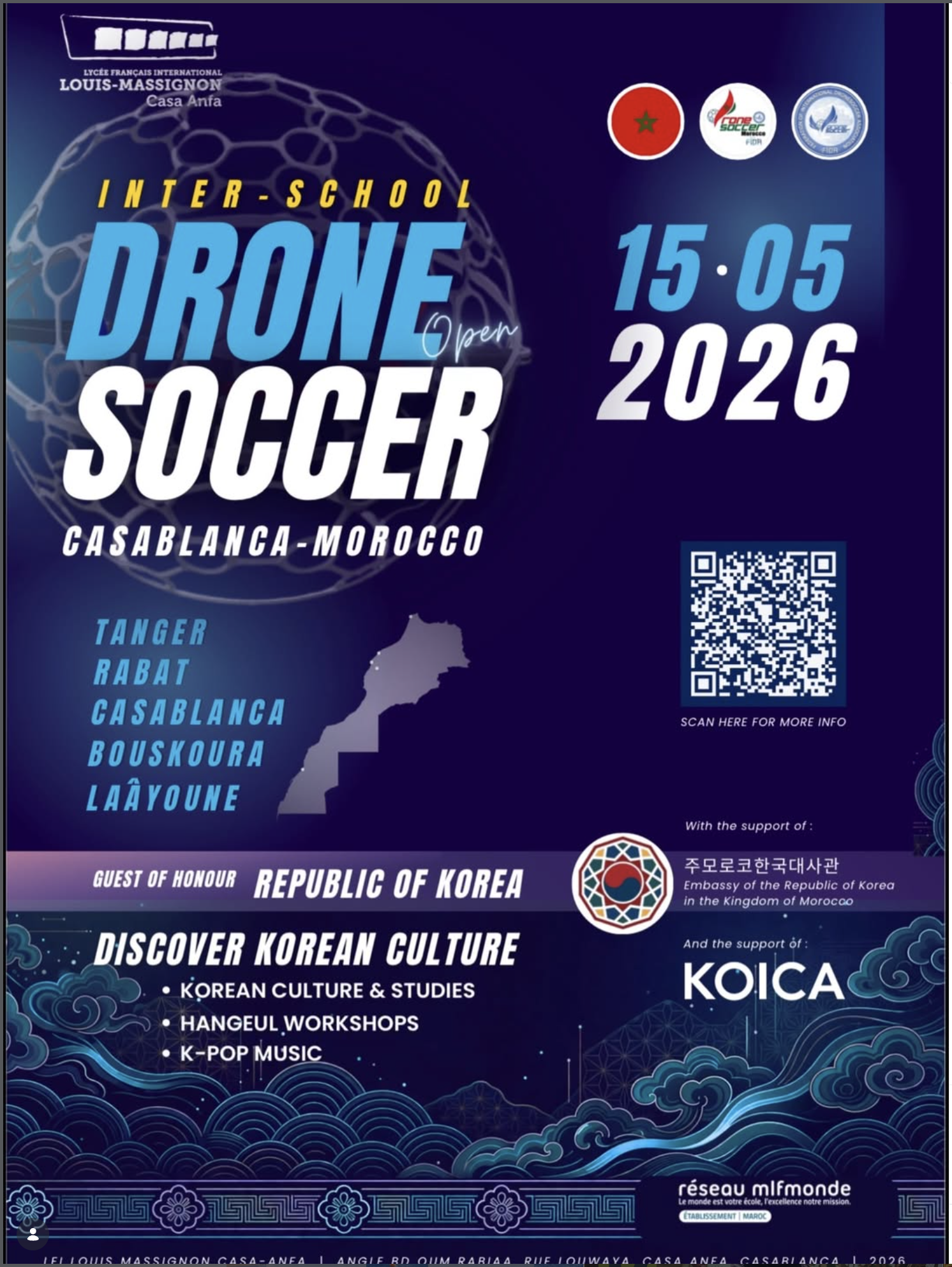 Inter-School Drone Soccer Open is an innovation-driven school competition in Casablanca combining sport, education, and technology through the fast-growing discipline of drone soccer. The event is designed to bring together school teams from different Moroccan cities in a format that highlights piloting skills, strategy, teamwork, and youth engagement, with the Republic of Korea featured as guest of honour and a wider cultural dimension built into the program. Drone soccer is presented as a collective 5v5 aerial sport played inside a protected arena, where teams defend their goal and create openings for the striker, the only player allowed to score. Beyond competition, the event is positioned as a strong educational and demonstration platform for schools, institutions, and partners, with a format that is accessible, visual, tactical, and well suited to youth development and emerging tech-sport ecosystems.