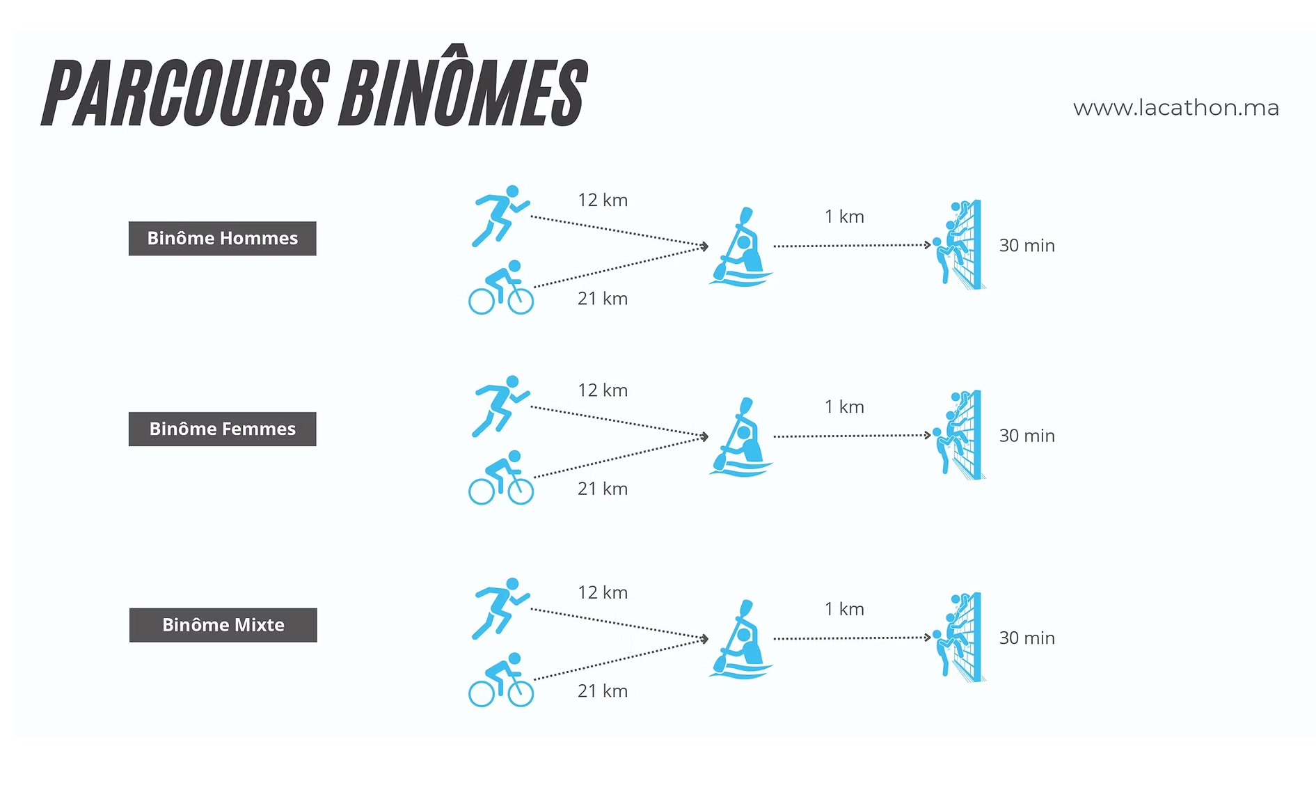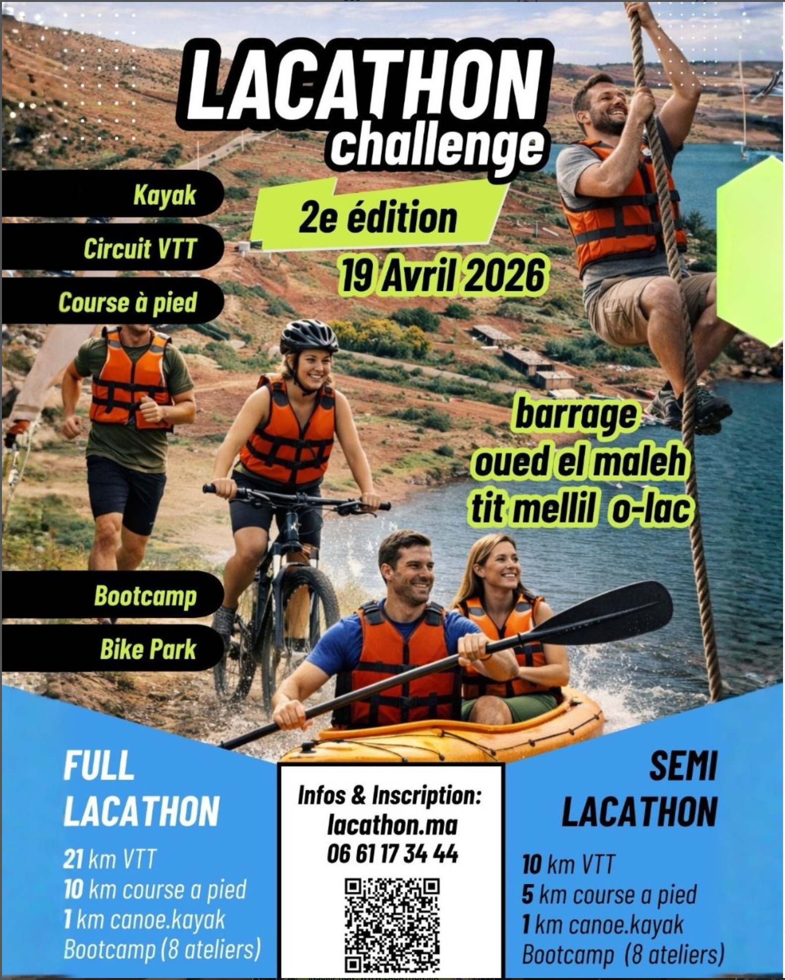 LACATHON Challenge is a multisport event held at Ô Lac, Barrage Oued El Maleh, near Casablanca. The official site presents the 2026 edition as the 2nd edition of the event and positions it as a sport-and-nature challenge linked to lake environments and environmental awareness.  The event includes two formats. The Full LACATHON Challenge combines 21 km of mountain biking, 10 km of running, 1 km of canoe-kayak, and 8 bootcamp stations, while the Semi LACATHON Challenge includes 10 km of mountain biking, 5 km of running, 1 km of canoe-kayak, and 4 bootcamp stations. The official registration page states that participation is open individually or in pairs.