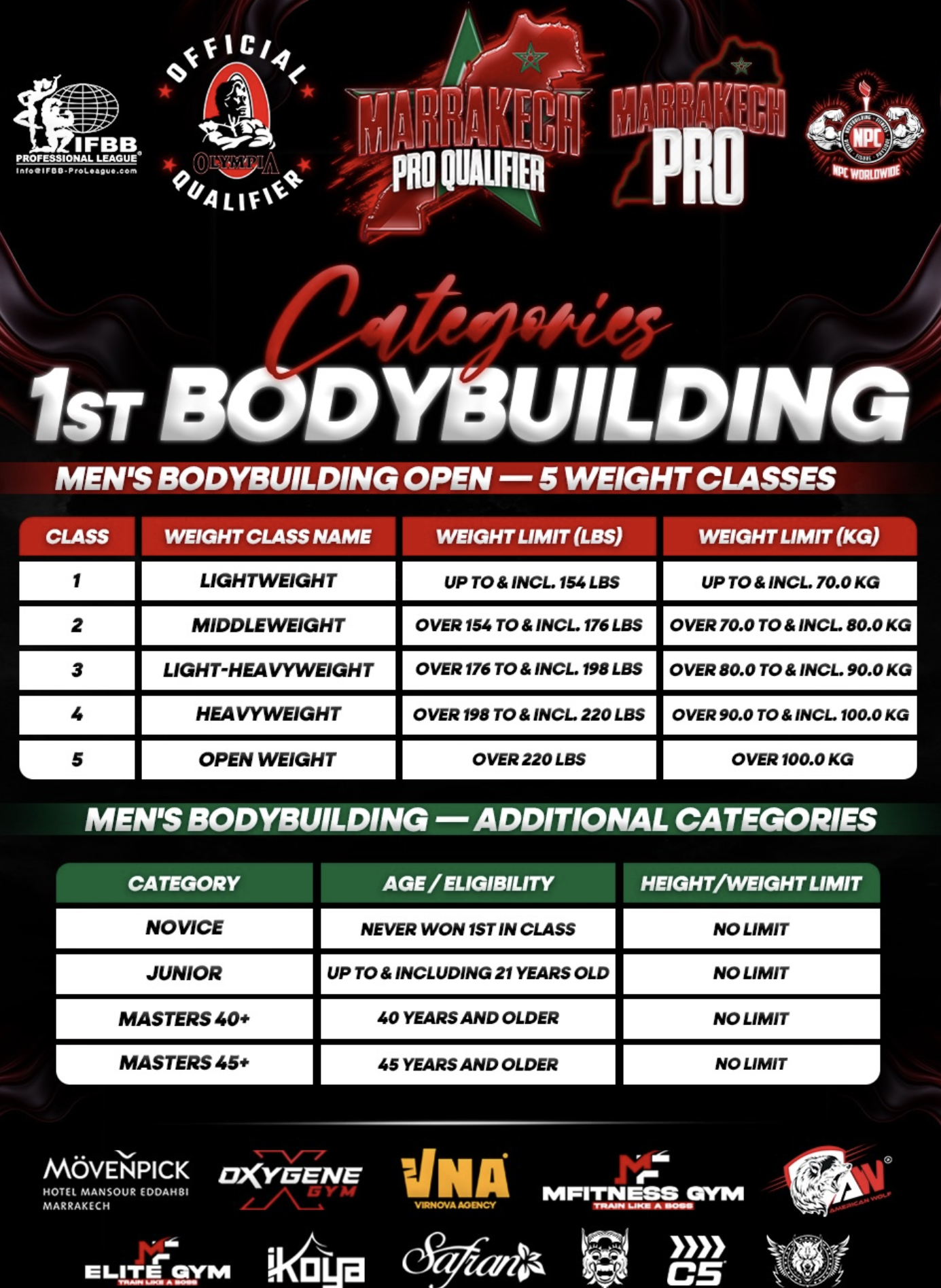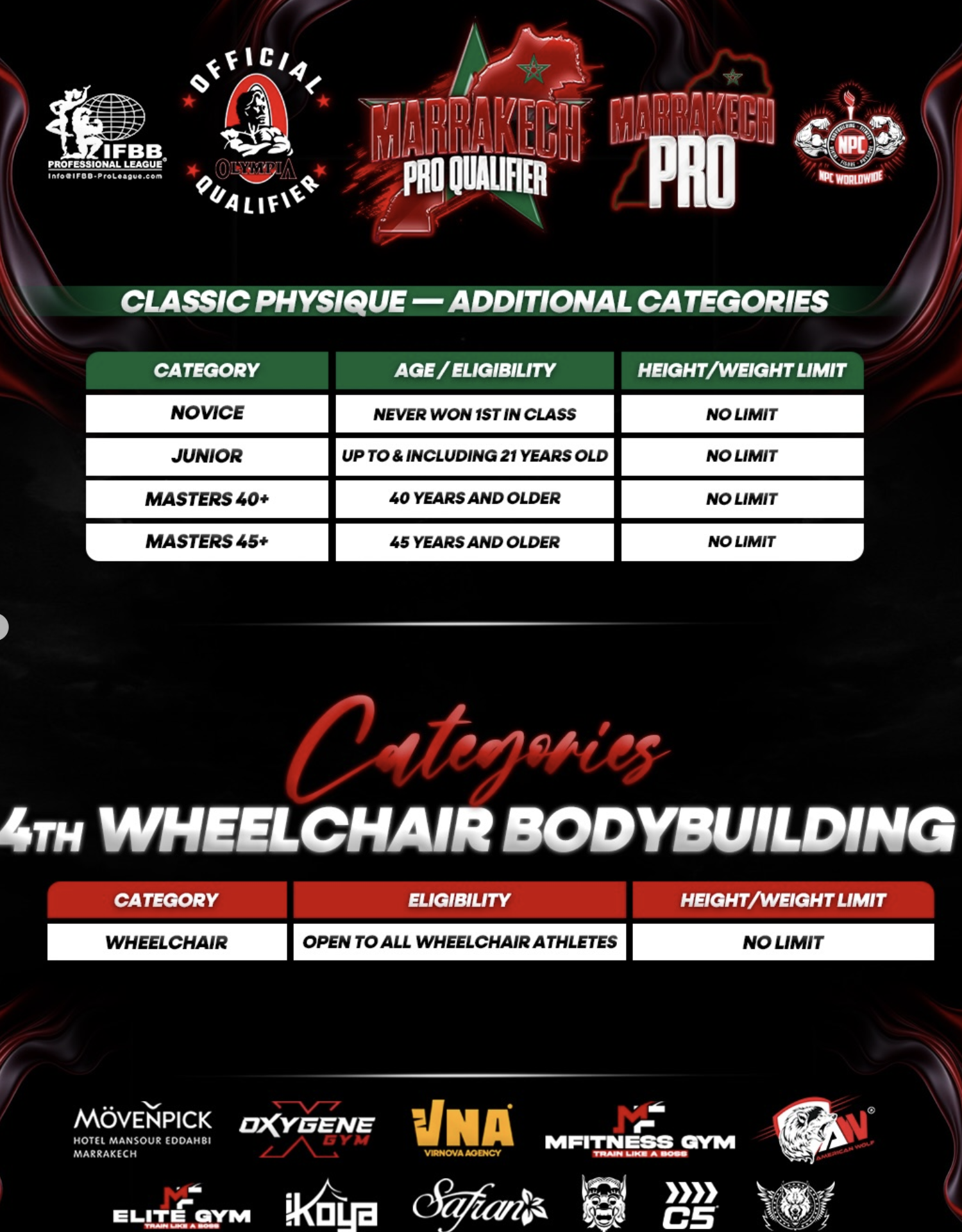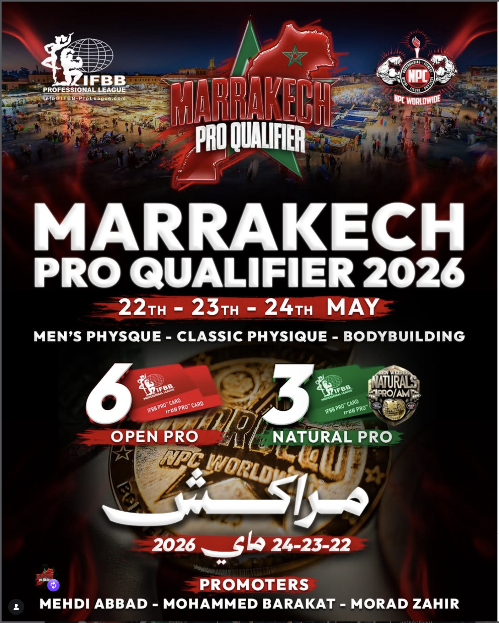 Marrakech Pro Qualifier — Pro Show is an IFBB Pro League and NPC Worldwide physique event combining amateur pro-qualifier competition with a pro-level show linked to the Olympia pathway. It is presented as an international bodybuilding event with Open and Natural Pro Qualifier opportunities, and official communication highlights the awarding of 6 Open Pro Cards and 3 Natural Pro Cards. The competition program includes Men’s Bodybuilding, Men’s Physique, Men’s Classic Physique, and Wheelchair Bodybuilding. The pro show is positioned around top-level physique competition under the IFBB Pro League / NPC Worldwide structure.