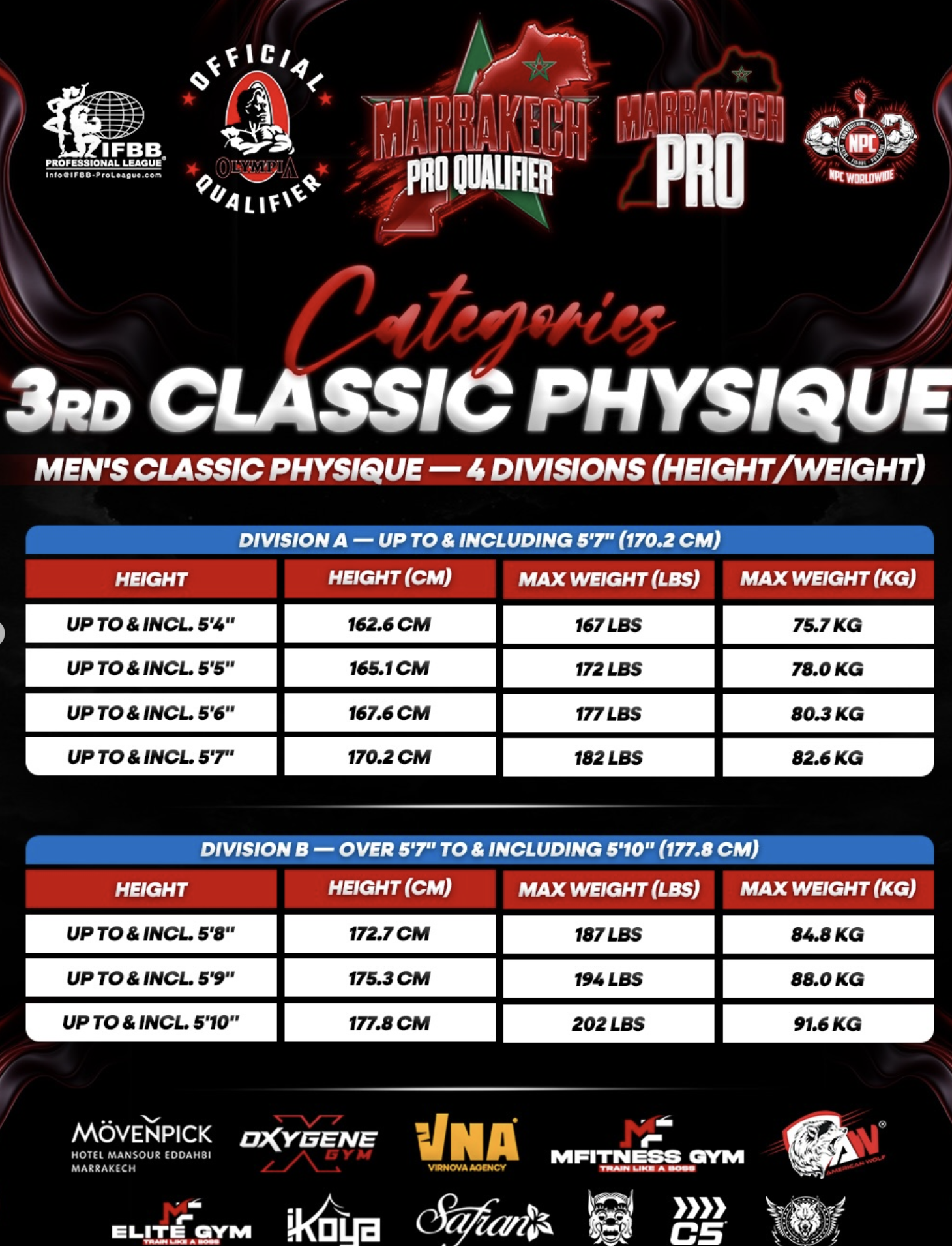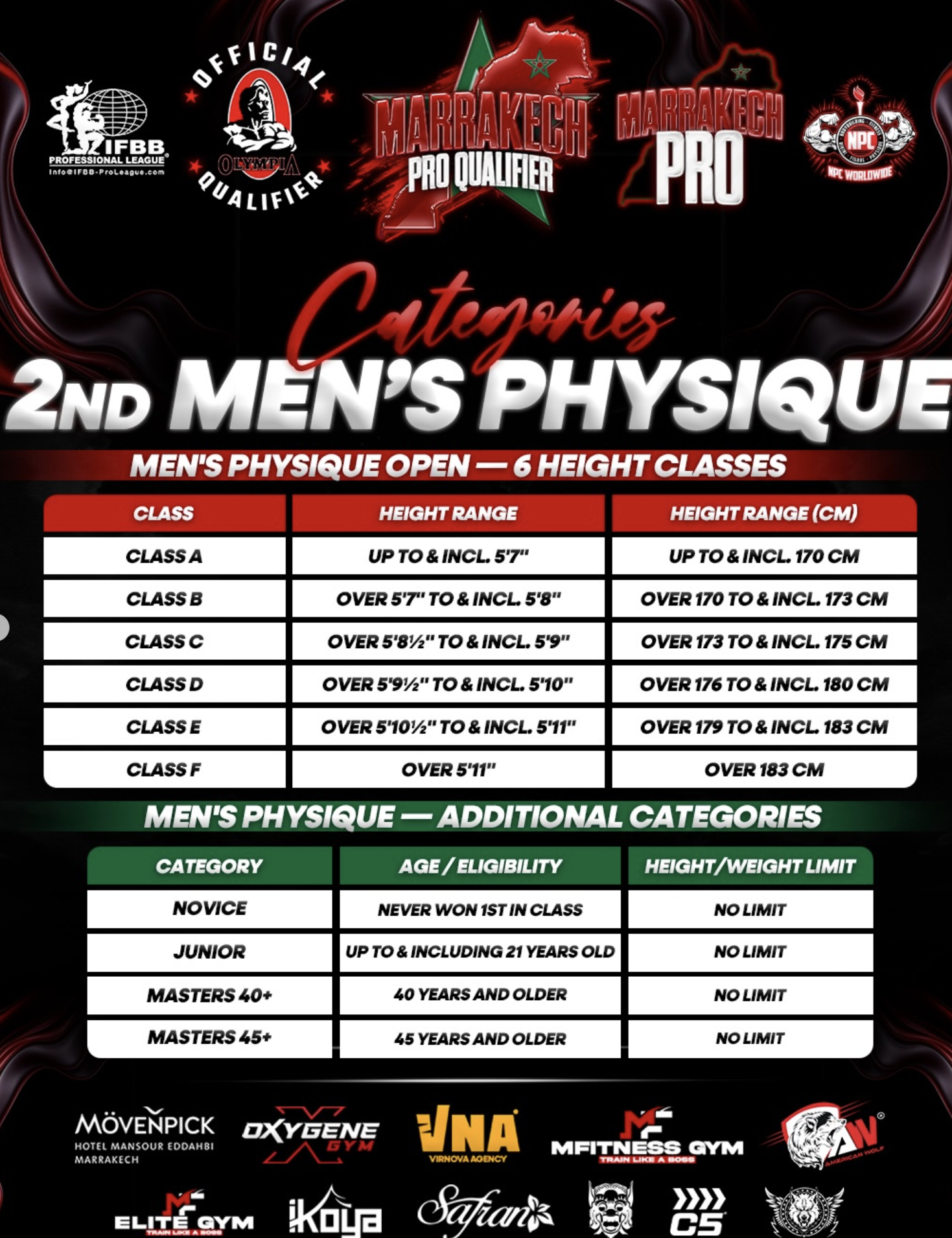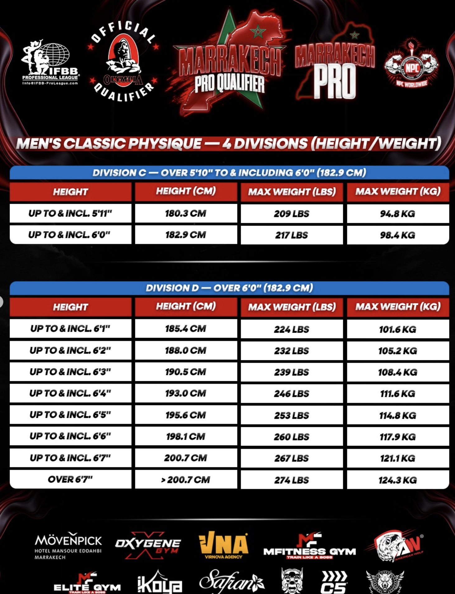 Marrakech Pro Qualifier — Pro Show is an IFBB Pro League and NPC Worldwide physique event combining amateur pro-qualifier competition with a pro-level show linked to the Olympia pathway. It is presented as an international bodybuilding event with Open and Natural Pro Qualifier opportunities, and official communication highlights the awarding of 6 Open Pro Cards and 3 Natural Pro Cards. The competition program includes Men’s Bodybuilding, Men’s Physique, Men’s Classic Physique, and Wheelchair Bodybuilding. The pro show is positioned around top-level physique competition under the IFBB Pro League / NPC Worldwide structure.