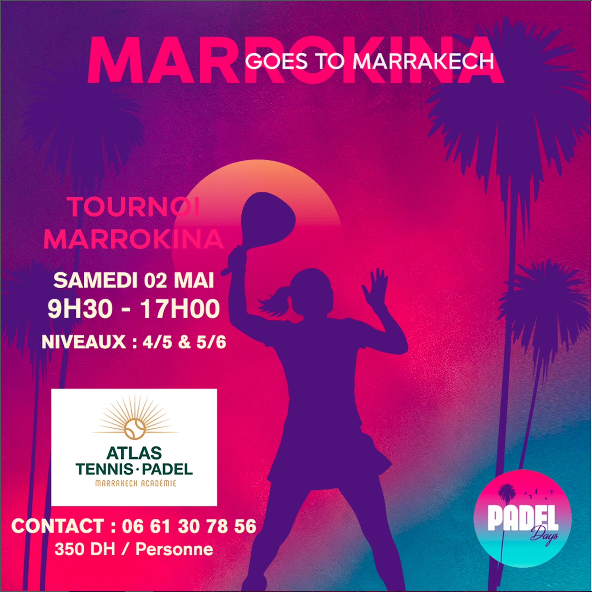 A Marrokina padel event hosted at Atlas Tennis Padel Marrakech Académie in Marrakech. The event is presented as a one-day tournament format during the extended weekend, with play scheduled at the club between morning and late afternoon. The tournament is aimed at women players in levels 4/5 and 5/6. Participation is limited, with registration handled through direct contact.