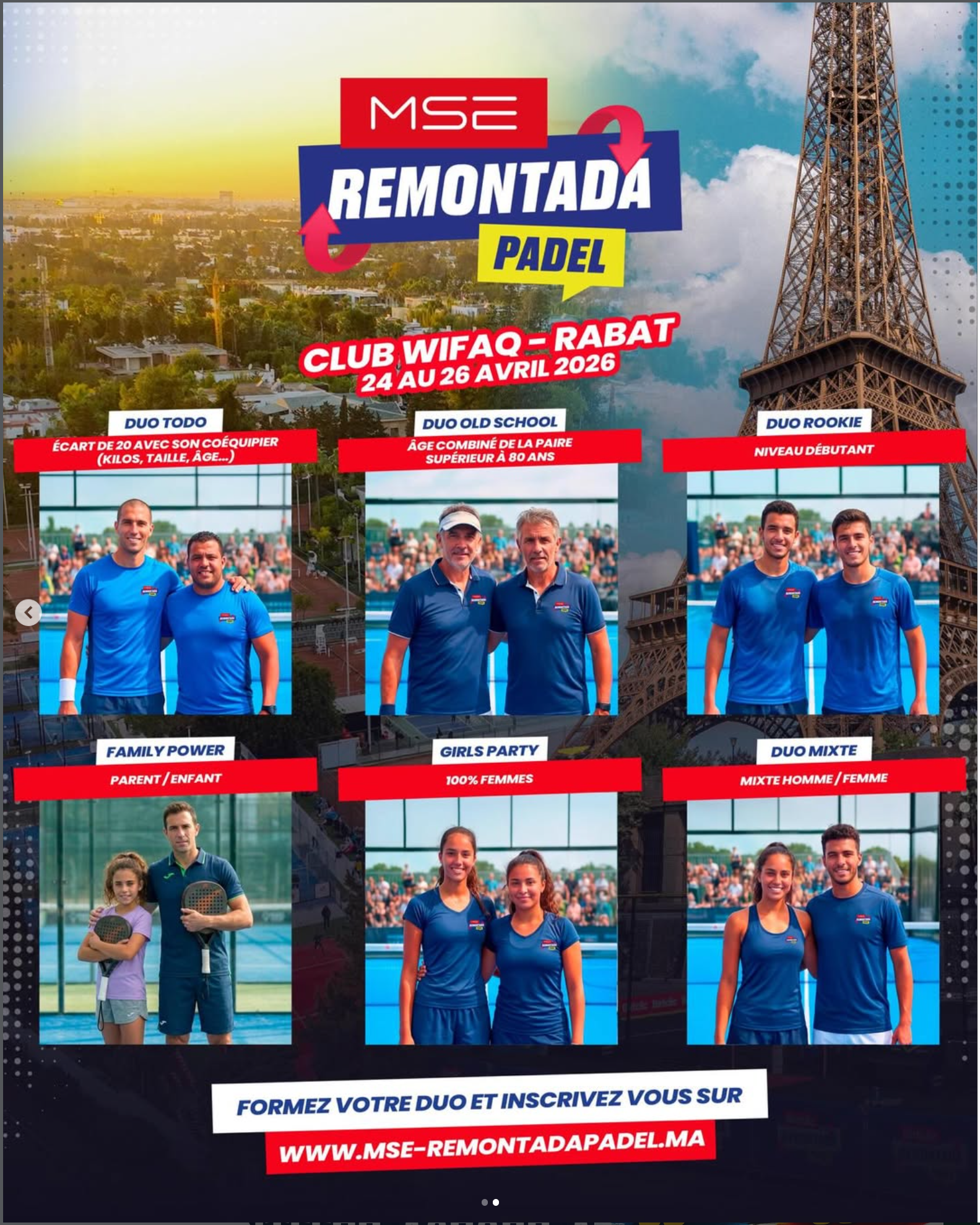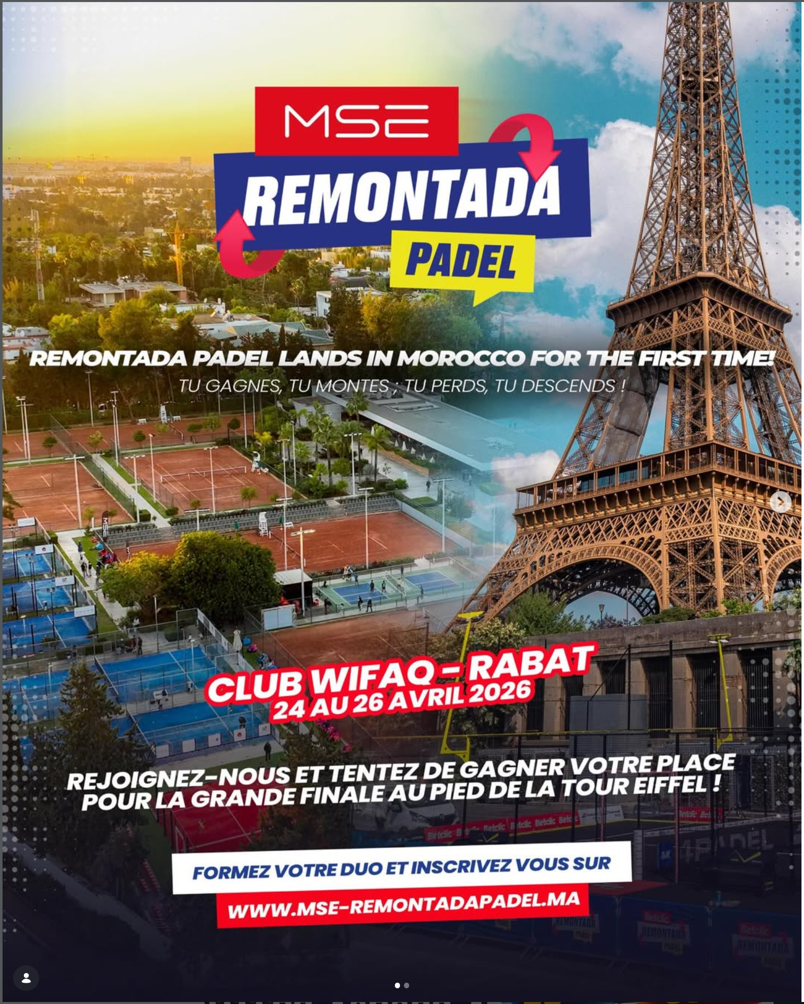 An amateur padel tournament organized by Madaëf Sports & Events at Club Wifaq in Rabat, as the first Morocco stop of the Remontada Padel circuit. The event is part of the third season of the circuit and is presented as a leisure-oriented competitive experience hosted at a multi-sport club with six padel courts. The tournament follows the Remontada format, where pairs play continuous timed matches and move up or down courts based on results. Six categories are listed: Todo, Duo Rookie, Old School, Mixte, Girl Party, and Family Power. The winning pair of each category can qualify for the finals in Paris, and the registration deadline is 2026-04-14.