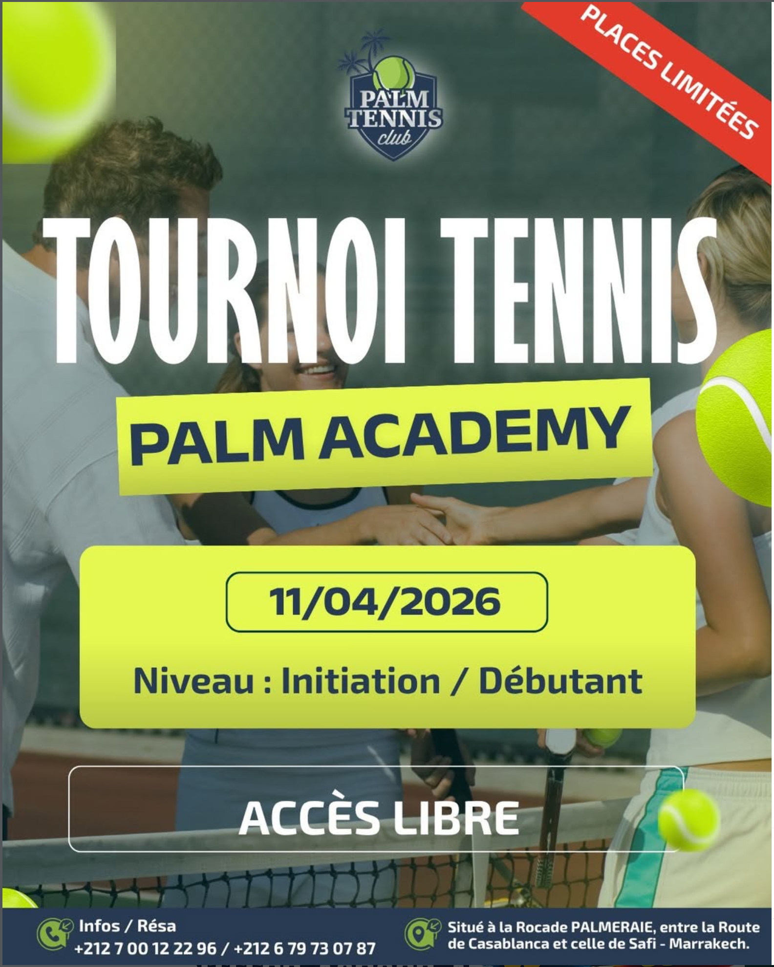 A beginner-focused tennis tournament organized by Palm Tennis Club & Padel Marrakech at Palm Tennis Club in Marrakech. The event is positioned as an initiation-level club competition for new players.  The format is intended for initiation and beginner participants, with a community-oriented club setting and open-access attendance indicated on the event flyer.