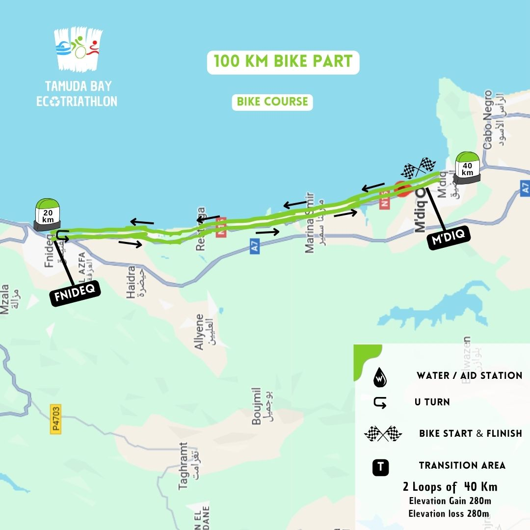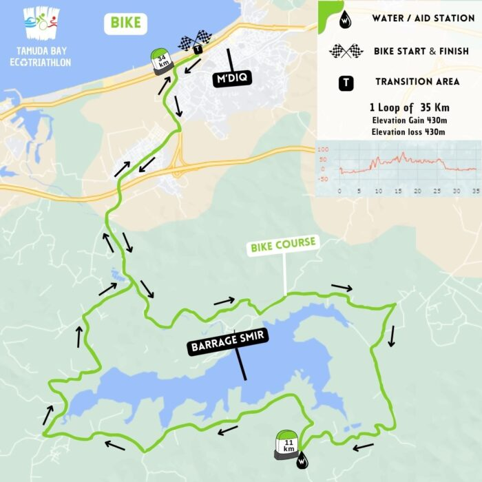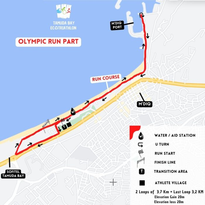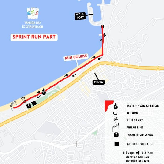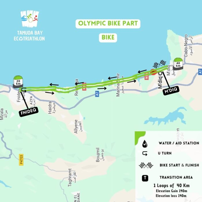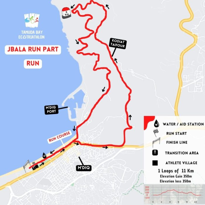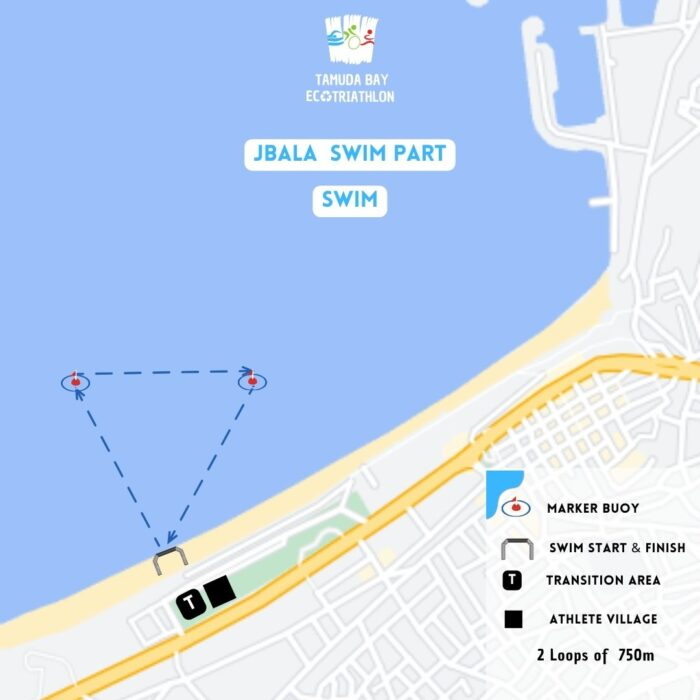 Triathlon event held in the Tamuda Bay area between Martil and M’diq on the Mediterranean coast. The competition includes multiple formats: Sprint, Olympic, JBALA cross triathlon and long-distance “100 KM Experience”, with both individual and relay options. Disciplines combine swimming, cycling and running, with some formats including mountain biking and trail running. Courses take place between coastal roads, beaches and the Rif mountains, with sections around Oued Martil and surrounding natural areas. The event integrates environmental measures such as waste management and use of local resources, and involves local communities through logistics, volunteering and regional participation.