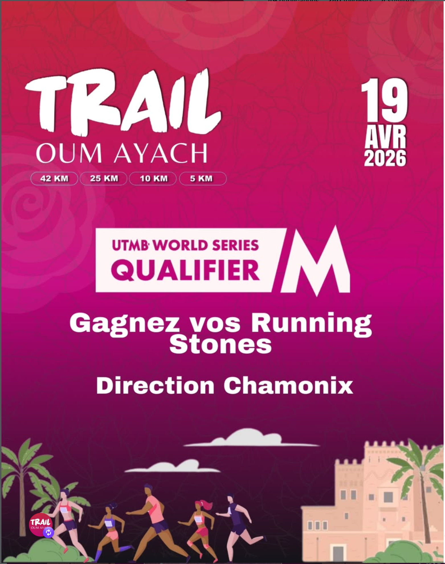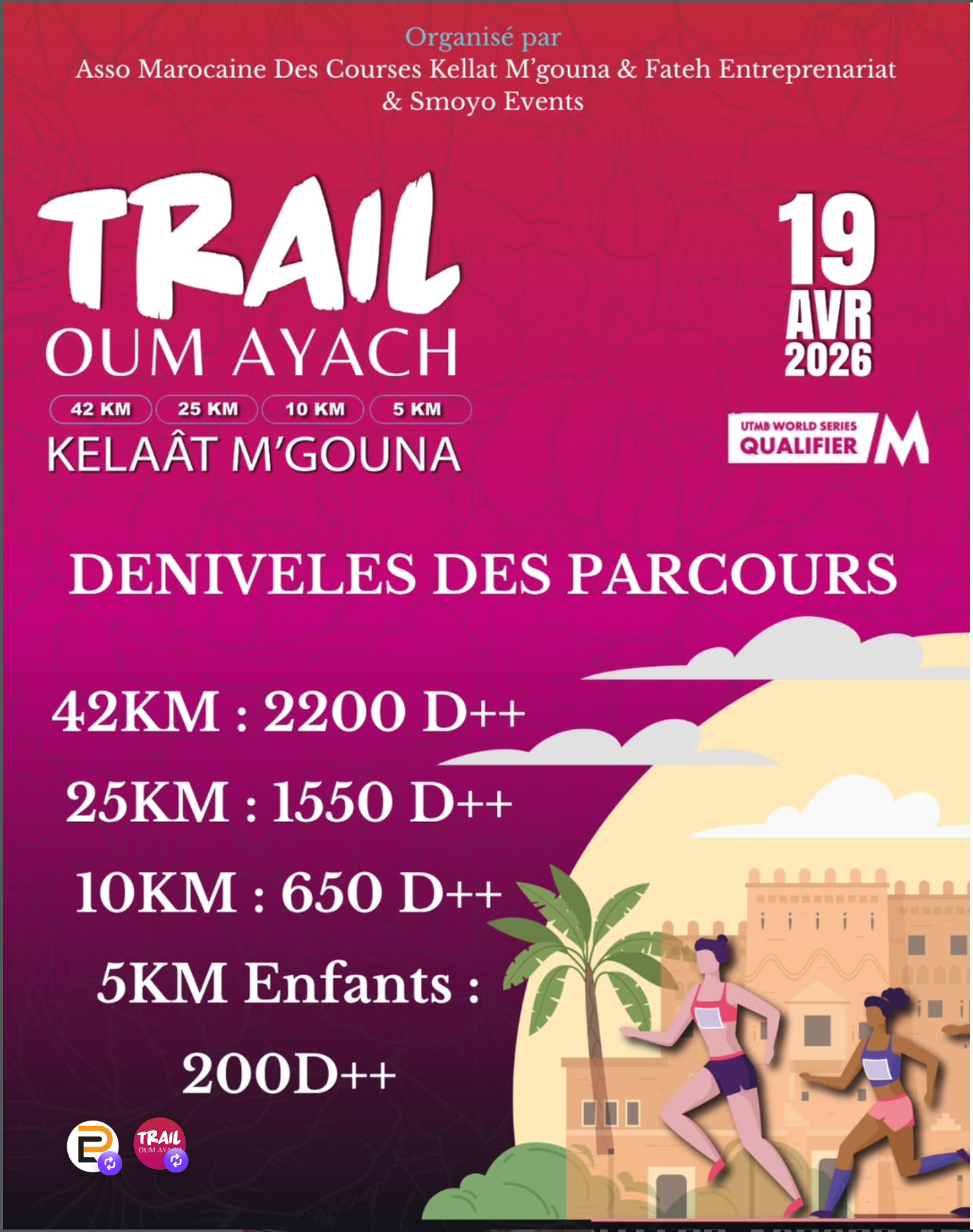 A trail running event organized by Asso Marocaine Des Courses Kelaat M’gouna, Fateh Entreprenariat, and Smoyo Events in Oum Ayach, near Kelaat M’Gouna. The event is presented as the official opening event of the Festival des Roses of Kelaat M’Gouna and as an official trail with national and international visibility.  The event offers four race formats: 42 km, 25 km, 10 km, and a 5 km children’s race. The official site presents it as a qualifying trail for the UTMB World Series, and the runner pack includes an official T-shirt, bib delivery, finisher medal, refreshment points, and access to selected Festival des Roses activities.