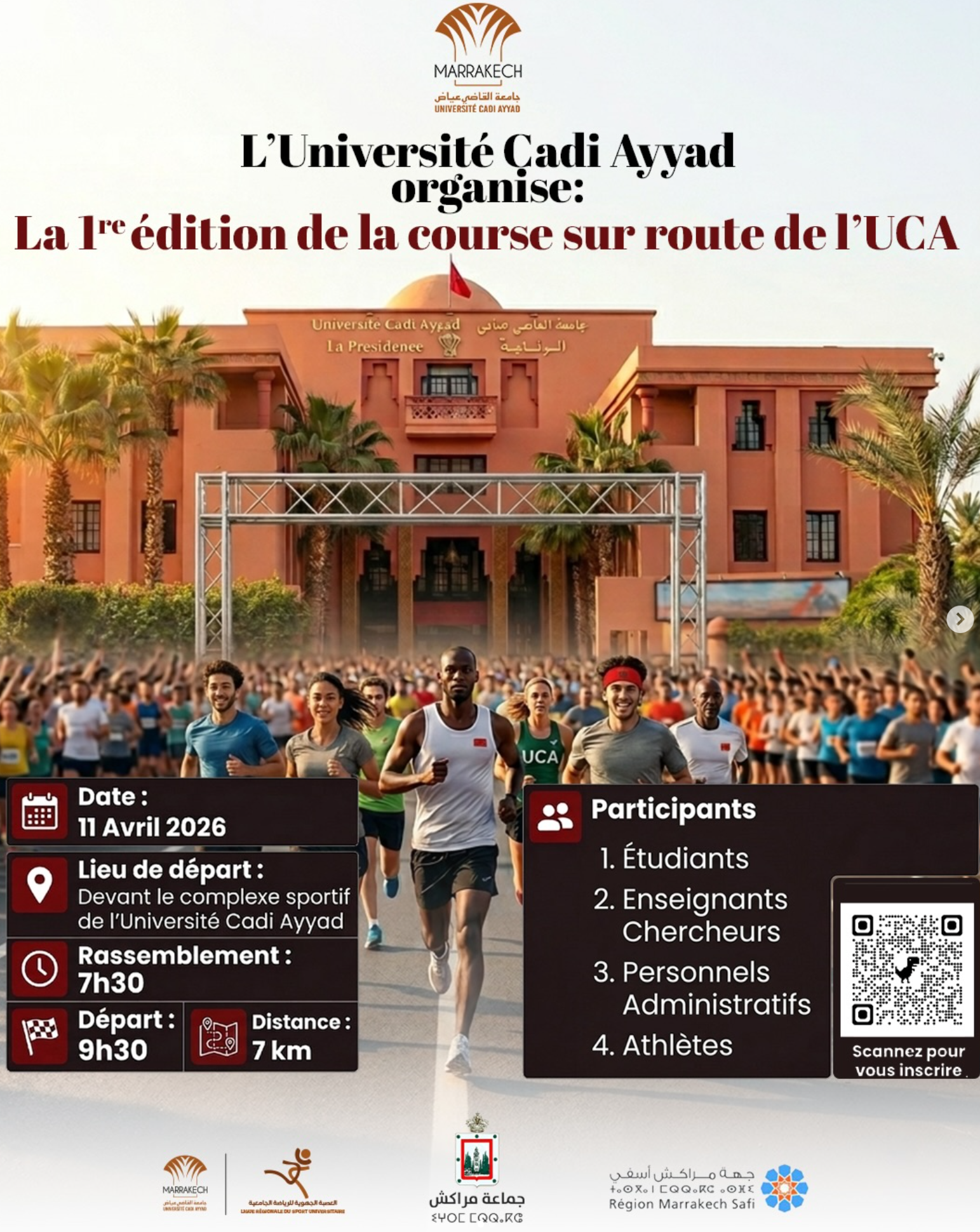 This road race is organized by Université Cadi Ayyad as part of its university sport and community cohesion activities. The event takes place in Marrakech, with start and finish in front of the UCA sports complex. The format is a 7 km road race open to students, teacher-researchers, administrative staff, and athletes. It is presented as the first edition of the event.